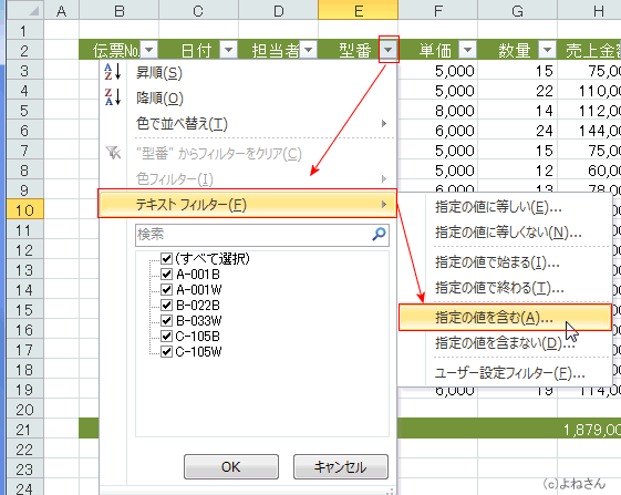 [テキスト フィルター]→[指定の値を含む]を実行します。
