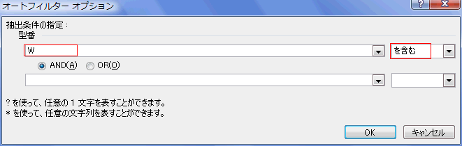 - 「型番」に「W」と入力し、右の欄を「を含む」にします。 [OK]ボタンをクリックします。