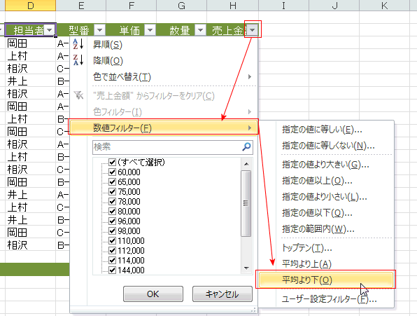 - 次いで、「売上金額」が「平均値より下」のデータを抽出します。
