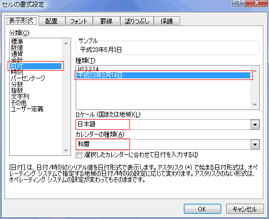 上記(A)と同様に、表示形式を「和暦」に変更します。