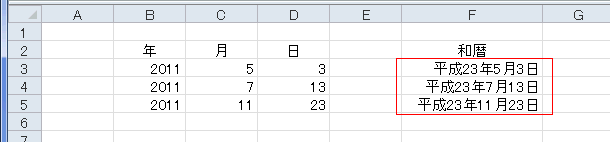 - Date関数を使って日付のシリアル値にし、表示形式で和暦を表示します。
