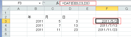 - F3セルに =B3&"/"&C3&"/"&D3 と入力すると値は日付のシリアル値に変換されます。