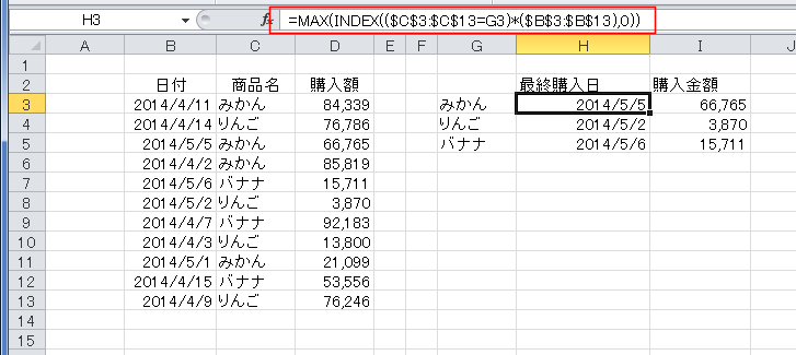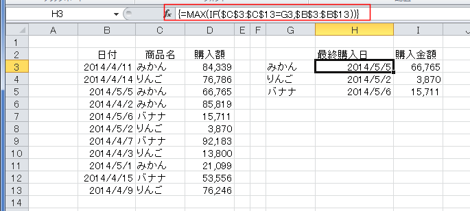 よって、商品名が「みかん」のデータの中で最も大きな日付を求めればよいことになります。