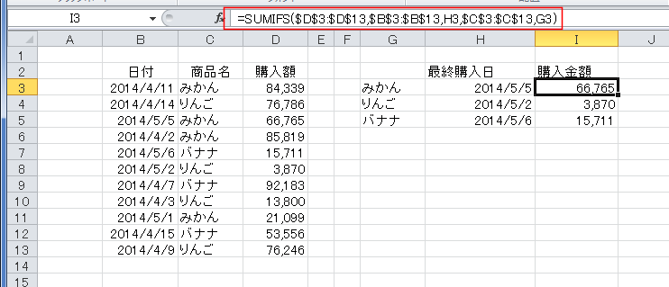 - 購入金額は商品名と日付が一致するデータの購入額を求めればよいので、SUMIFS関数を使うことができます。