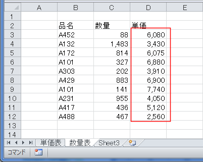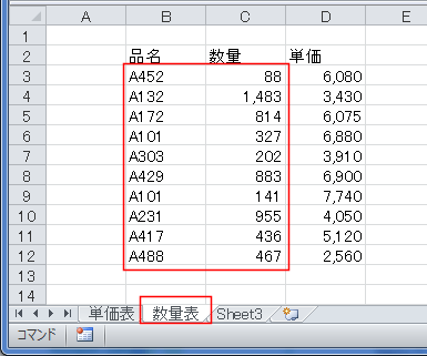 | Sub test2() Dim i As Integer, j As Integer Dim cn As Integer Dim kazu As Double With Worksheets("数量表") cn = 2 For i = 1 To 10 cn = cn + 1 kazu = Int(Rnd() * (1500 - 10 + 1) + 10) .Cells(cn, 3) = kazu kazu = Int(Rnd() * (500 - 1 + 1) + 1) .Cells(cn, 2) = "A" & Format(kazu, "000") Next i End With End Sub |