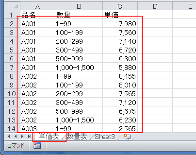 | Function keisan(myR1 As Range, myR2 As Range) As Double Dim i As Long Dim myLot As Variant Dim myFlag As Boolean Dim tanka As Variant myFlag = False With Worksheets("単価表") tanka = .Range("A2:C3001").Value End With For i = LBound(tanka) To UBound(tanka) If tanka(i, 1) = myR1.Value Then myLot = Split(tanka(i, 2), "-") If myR2.Value >= Val(Replace(myLot(0), ",", "")) And myR2.Value <= Val(Replace(myLot(1), ",", "")) Then keisan = tanka(i, 3) myFlag = True Exit For End If End If Next i If myFlag = False Then keisan = -99999 Application.Volatile End Function |