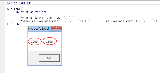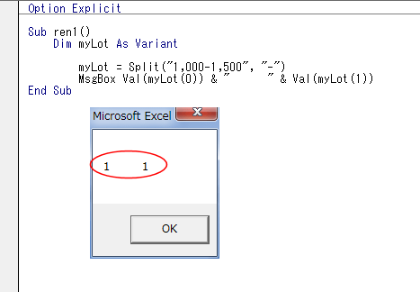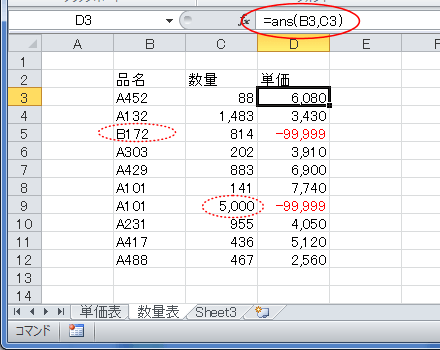 | Function ans(myR1 As Range, myR2 As Range) As Double Dim i As Long Dim myLot As Variant Dim myFlag As Boolean myFlag = False With Worksheets("単価表") For i = 2 To 3001 If .Cells(i, 1).Value = myR1.Value Then myLot = Split(.Cells(i, 2).Value, "-") If myR2.Value >= Val(Replace(myLot(0), ",", "")) And myR2.Value <= Val(Replace(myLot(1), ",", "")) Then ans = .Cells(i, 3).Value myFlag = True Exit For End If End If Next i End With If myFlag = False Then ans = -99999 Application.Volatile End Function |