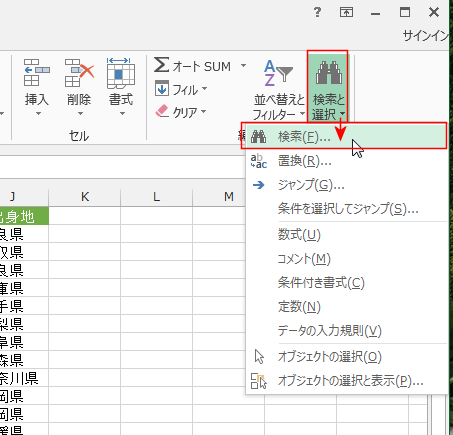 - [ホーム]タブの[検索と選択]→[検索]をクリックします。ショートカットキーは[Ctrl]+[F]です。