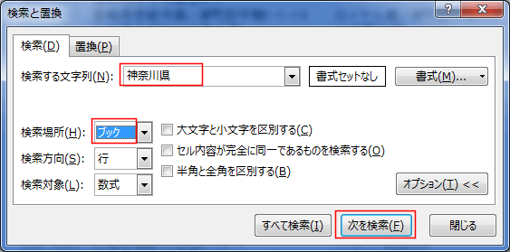[次を検索]ボタンをクリックすると、「神奈川県」を含む次のセルが選択されます。