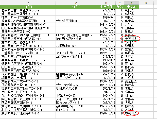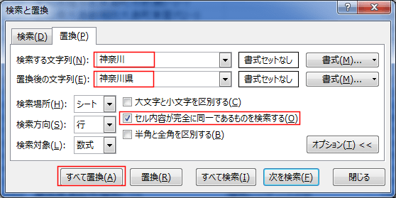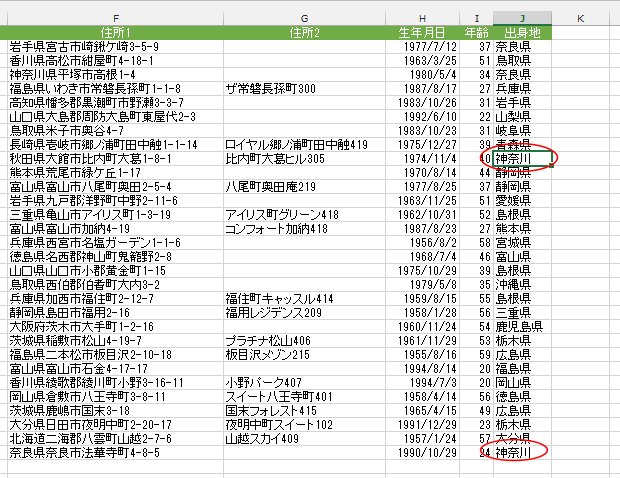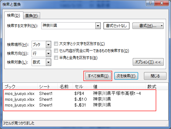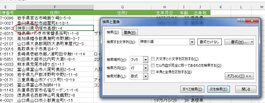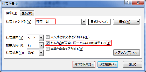 - 「神奈川県」と完全に一致するセル2個が検索できました。