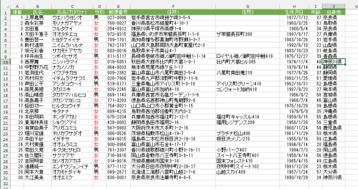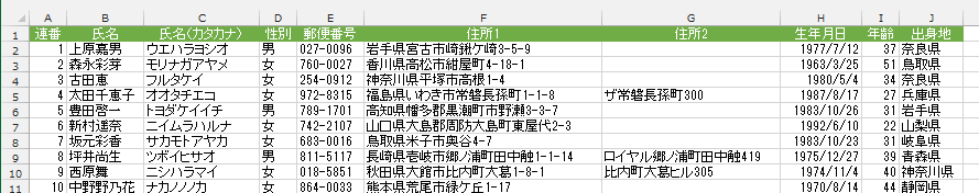 - ここでは、下図のような住所録ファイルを使って説明します。 ファイルは mos_jyusyo.xlsx です。