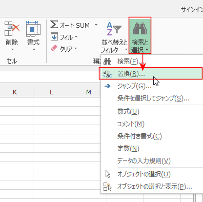 - [ホーム]タブの[検索と選択]→[置換]をクリックします。ショートカットキーは[Ctrl]+[H]です。