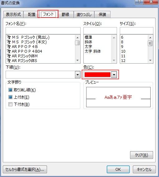 - [書式]ボタンをクリックしてフォントの色を「赤」にします。