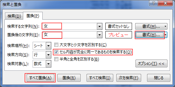 置換後の文字列に「女」と入力します。[書式]ボタンをクリックしてフォントの色を「赤」にします。