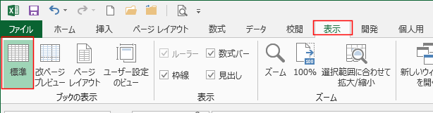 - 標準ビューには[表示]タブのブックの表示 グループの[標準]をクリックします。