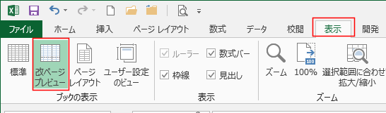 - [表示]タブのブックの表示 グループの[改ページプレビュー]をクリックします。