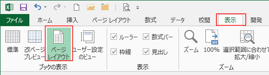 - [表示]タブのブックの表示 グループの[ページレイアウト]をクリックします。