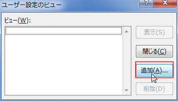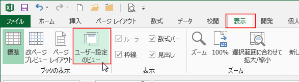 - [表示]タブのブックの表示 グループの[ユーザー設定のビュー]をクリックします。