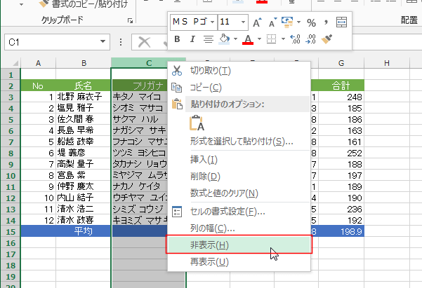 よねさんのExcelとWordの使い方|Excel2013 MOS講座:スペシャリスト(一般)の目次|行や列を非表示にする/再表示する