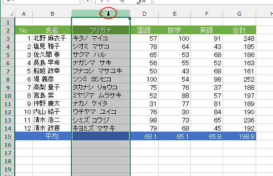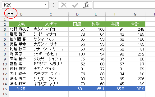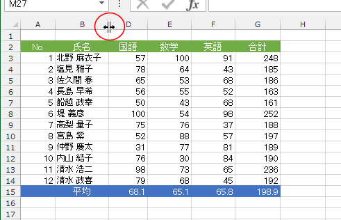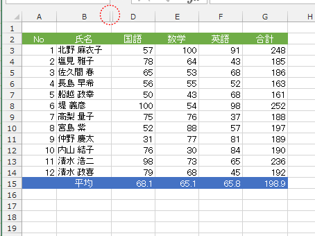 - B列の左側にマウスポインタを合わせ、下図のようなマウスポインタの形でダブルクリックします。