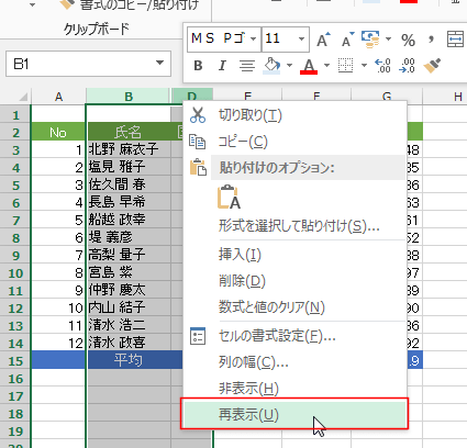 右クリックメニューから行や列を再表示する