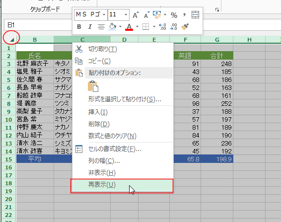選択している列番号を右クリックします。右クリックメニューの[再表示]を選択します。