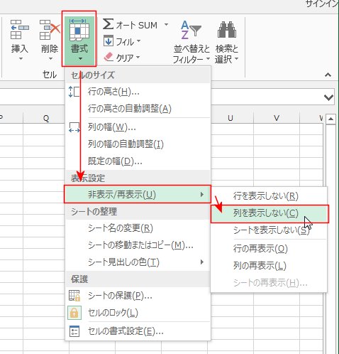 - [ホーム]タブの[書式]→[非表示/再表示]→[列を表示しない]を実行します。