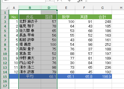 - 再表示する列の前後を選択します。ここの例では C列を非表示にしているので B:D列を選択します。