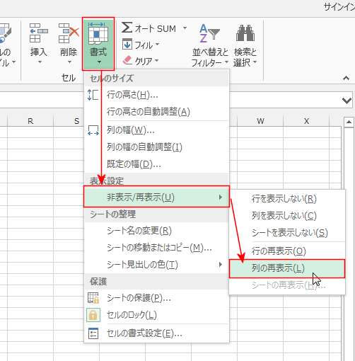 - [ホーム]タブの[書式]→[非表示/再表示]→[列の再表示]を実行します。