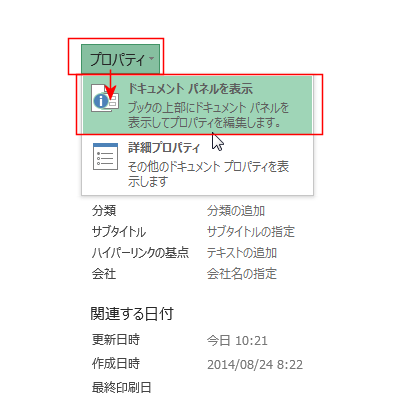 - [情報]の[プロパティ]をクリックして、[ドキュメントパネルを表示する]を選択します。
