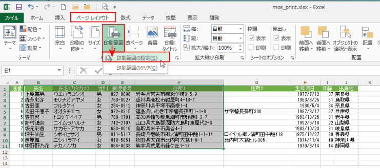 [ページレイアウト]タブの[印刷範囲]→[印刷範囲の設定]を実行します。