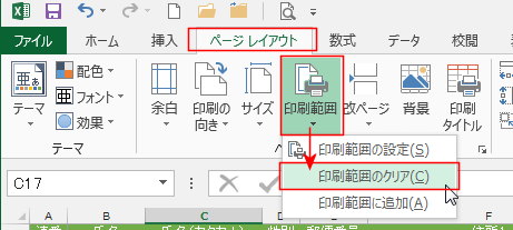 - [ページレイアウト]タブの[印刷範囲]→[印刷範囲のクリア]を実行します。