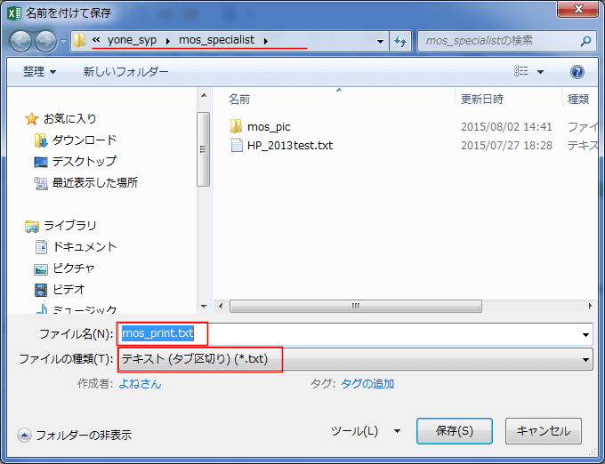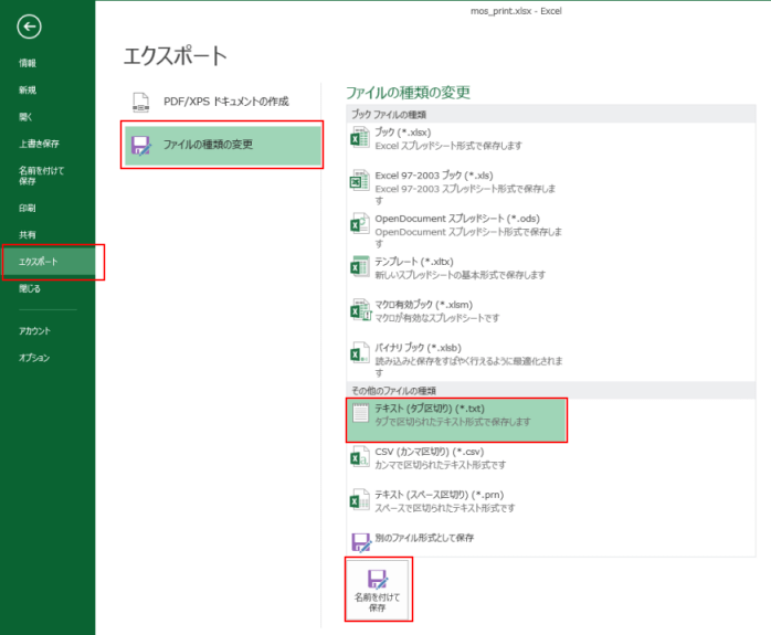 ここでは、その他のファイルの種類で「テキスト(タブ区切り)(*.txt)」を選択しました。