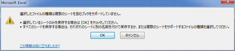 - テキストファイル形式やCSV形式では選択しているシートのみが保存されるとの注意が表示されます。