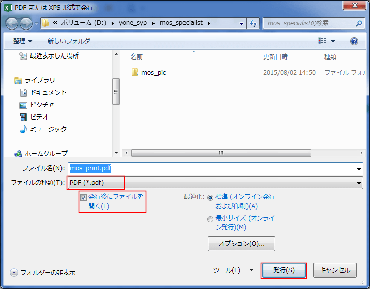 「発行後にファイルを開く」にチェックが入っているのを確認します。