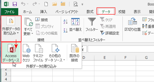 ウィンドウの表示幅が狭い場合は[データ]タブの[外部データの取り込み]→[Accessデータベース]をクリックします。
