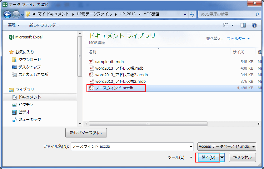 外部データ(Accessのデータファイル)が保存してあるフォルダーを開きます。