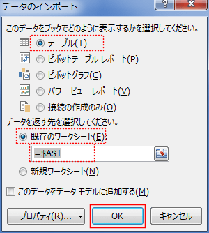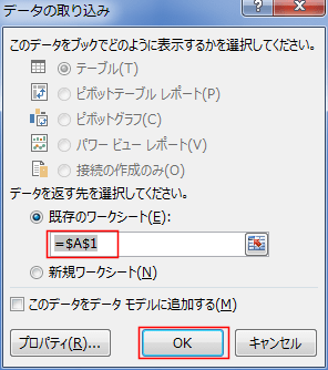 データの取り込みでデータを返す先が「=$A$1」となっているのを確認します。