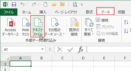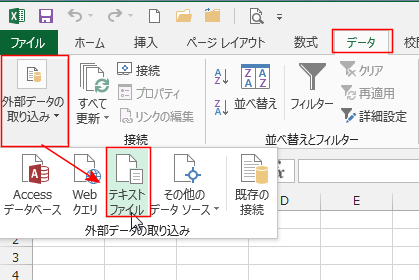 ウィンドウの表示幅が狭い場合は[データ]タブの[外部データの取り込み]→[テキストファイル]をクリックします。