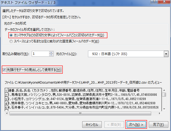 「先頭行をデータの見出しとして使用する」にチェックを入れます。