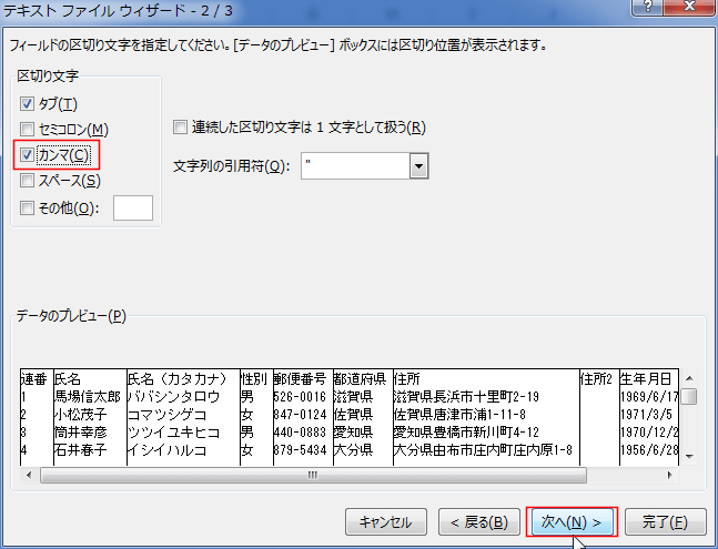 「カンマやタブなどの区切り文字によってフィールドごとに区切られたデータ」にチェックを入れます。