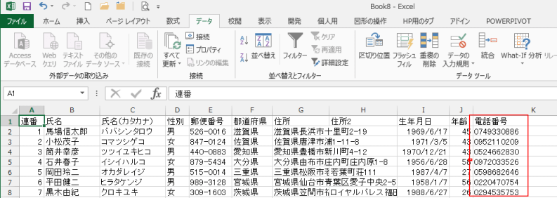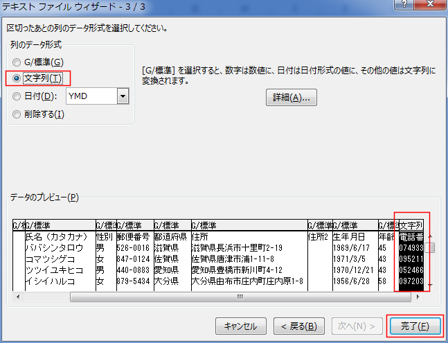 Excelで文字列として読み込みたい列を選択します。ここの例では「電話番号」の列を選択します。
