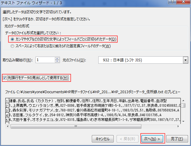 「先頭行をデータの見出しとして使用する」にチェックを入れます。