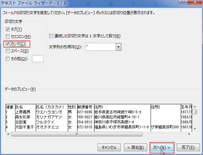 「カンマやタブなどの区切り文字によってフィールドごとに区切られたデータ」にチェックを入れます。