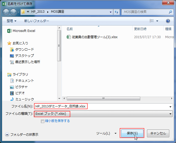 ファイルの種類で 「Excel ブック (*.xlsx)」を選択します。