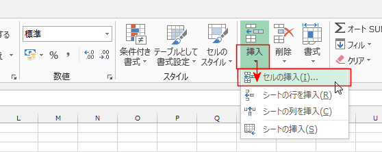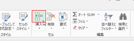 - [ホーム]タブの[挿入]→[セルの挿入]を実行します。