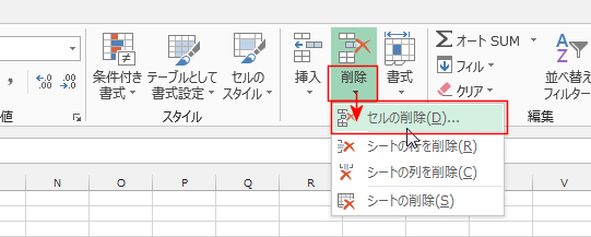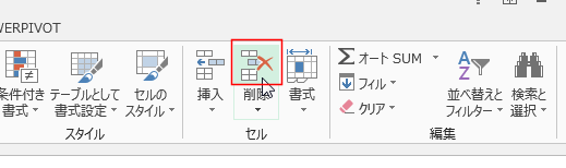 - [ホーム]タブの[削除]→[セルの削除]を実行します。