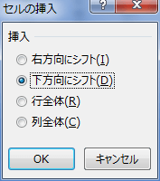 セルを挿入した時にまわりのセルをどの方向へ移動するかを選択します。