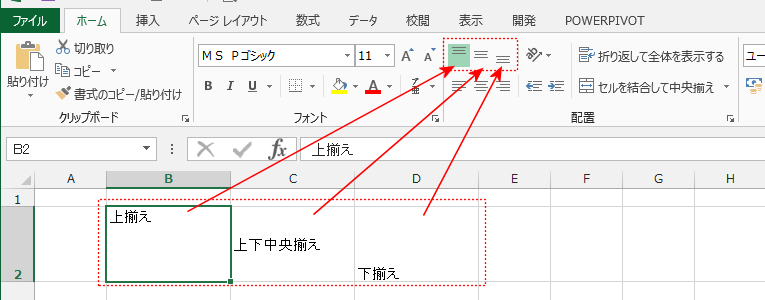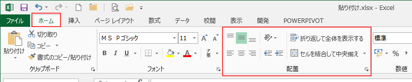 - セルの配置は[ホーム]タブの配置グループにあるコマンドから実行することができます。