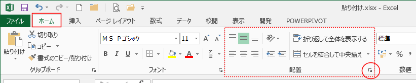 - [ホーム]タブの配置グループにあるダイアログボックス起動ツールをクリックします。